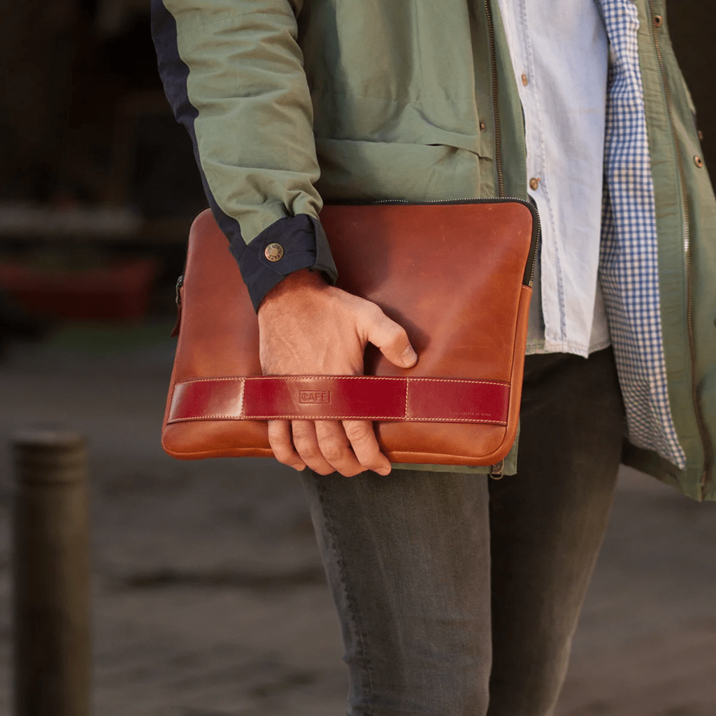 Sigo con este, de Cafe Leather, también con cremallera y cinta de agarre granate, me encanta.